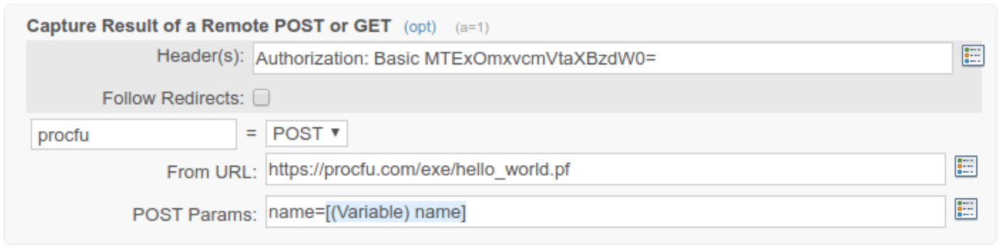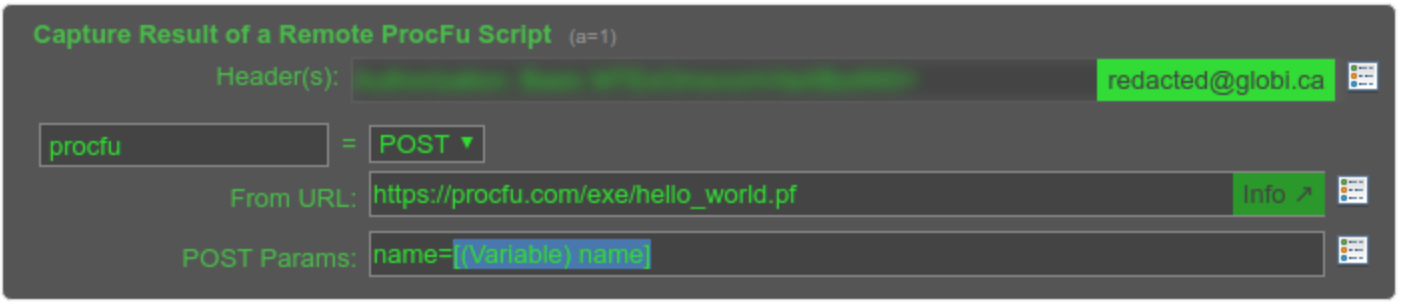 Tip: When passing values to ProcFu block, always use the individual variable tokens to ensure correct encoding. Avoid putting values directly into the POST Params