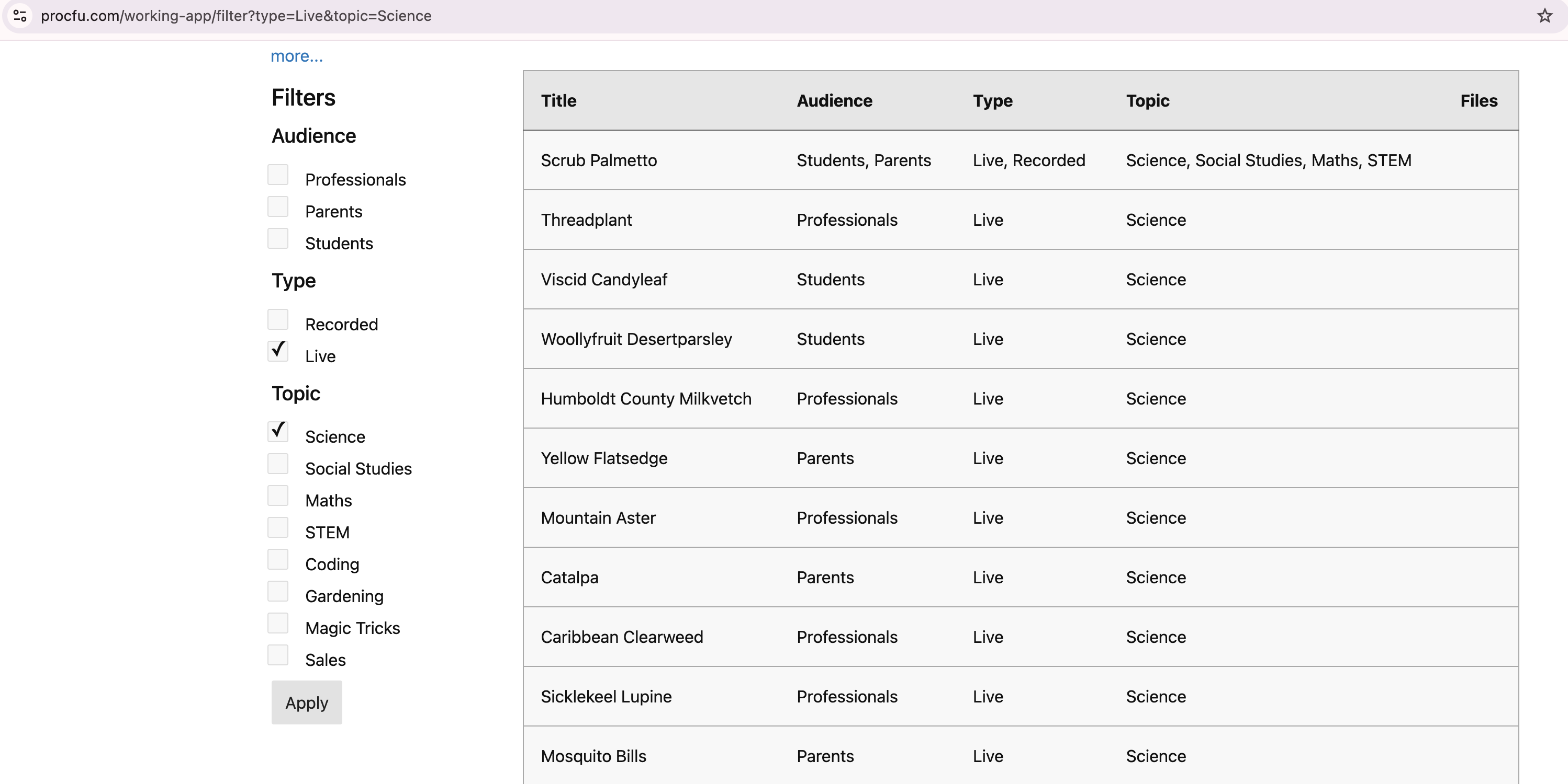 I have a Podio app called "Courses" with a list of courses. There are three category fields used for filtering: Audience, Type, and Topic. All of them are multi-select fields.
