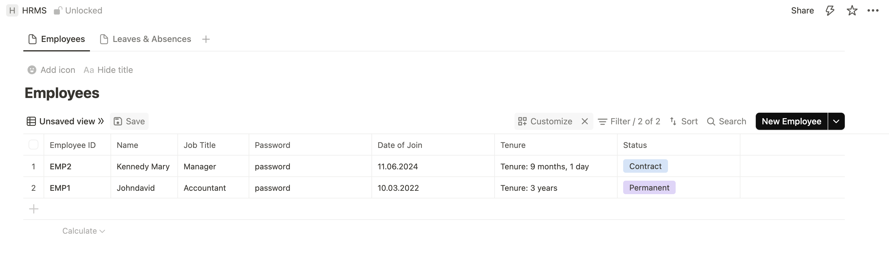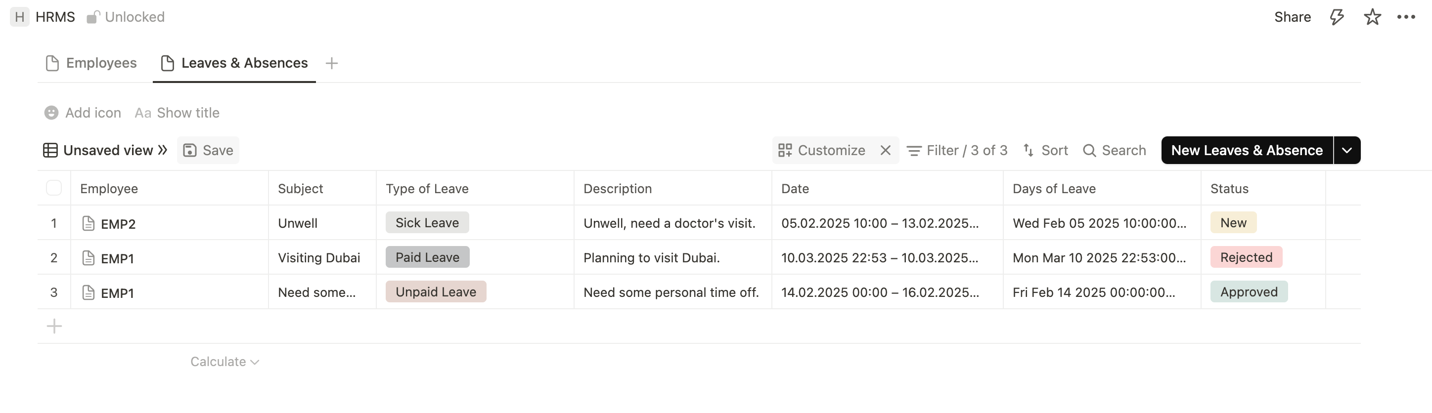 - Absences and Leaves Table - Stores leave records, with a relation tying each leave record back to an employee.