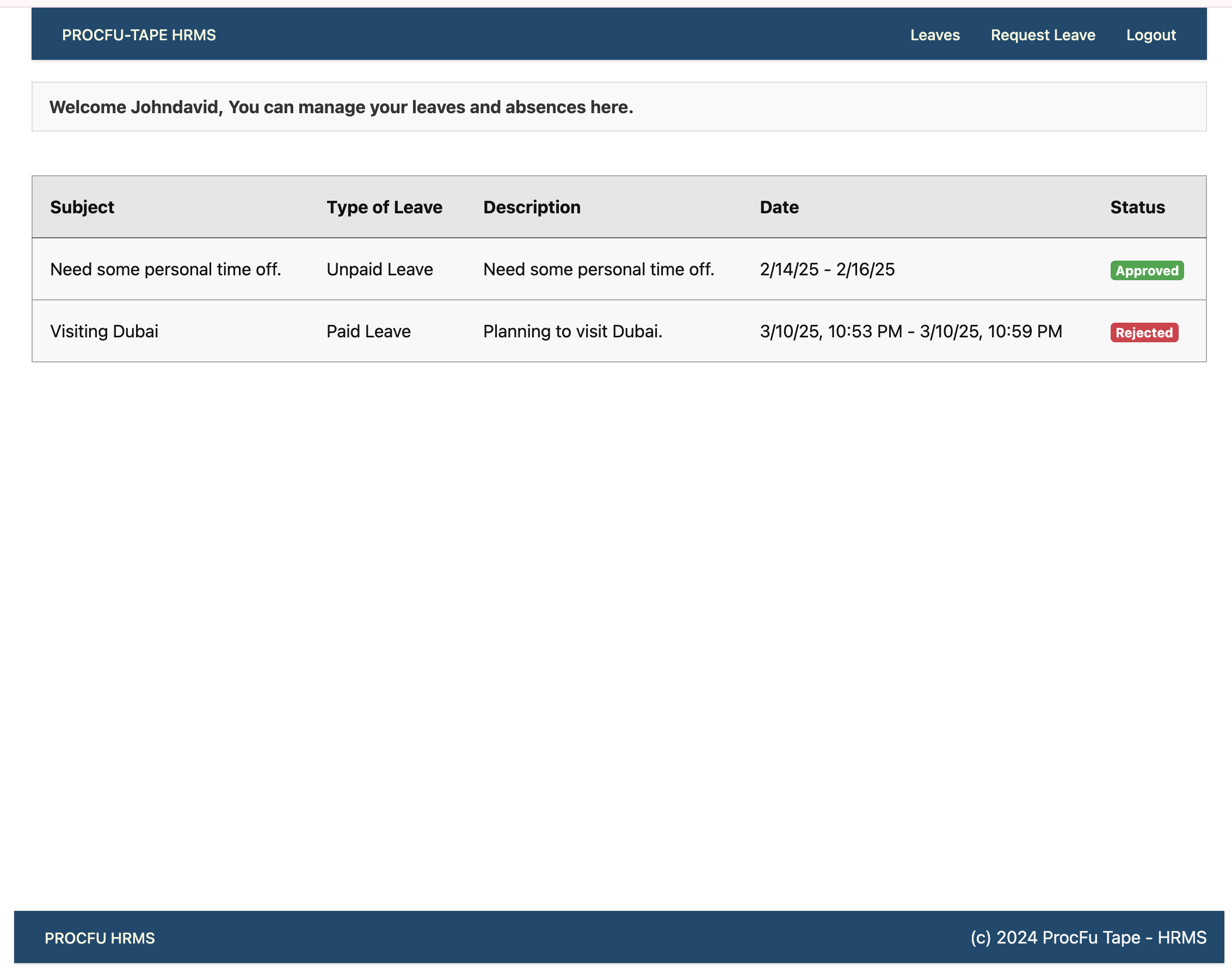 Once logged in, users are directed to the index screen where they can see all their leave records. A Request Leave button allows users to submit new leave requests.
