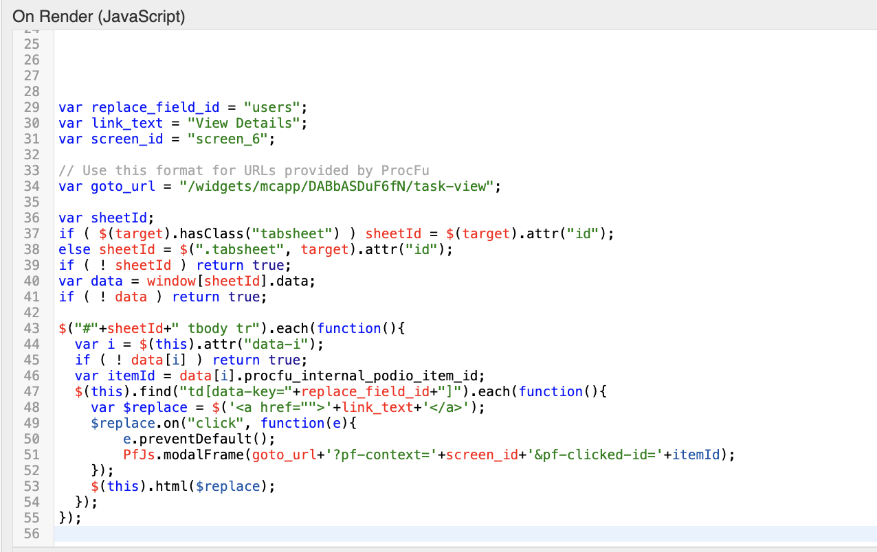 Insert JavaScript Code: Add the following JavaScript code to the On-Render event of your sheet page to dynamically generate and insert links into the placeholder field.